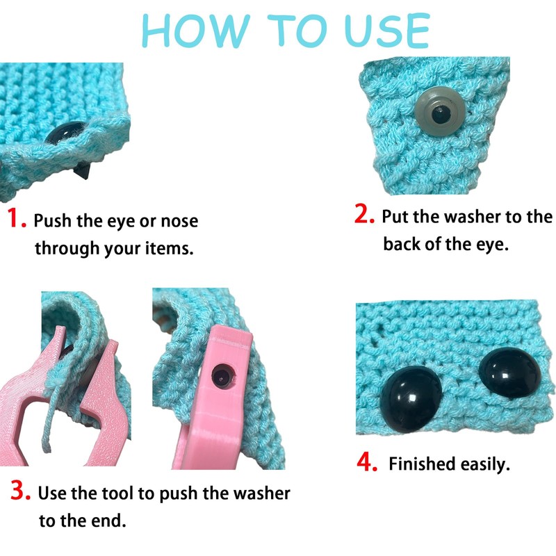 - EASY TO USE: First insert the safety eye into your plush, then place the back washer onto the eye, finally align it with the pliers' hole, squeeze to secure. Please refer to the video for specific usage methods.