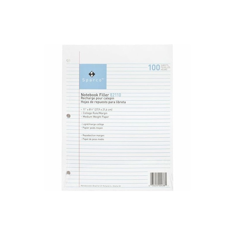 Sparco Filler Paper, 3-HP, College Ruled, 11 x 8-1/2 Inches, 100 per Pack, White (SPR82110)