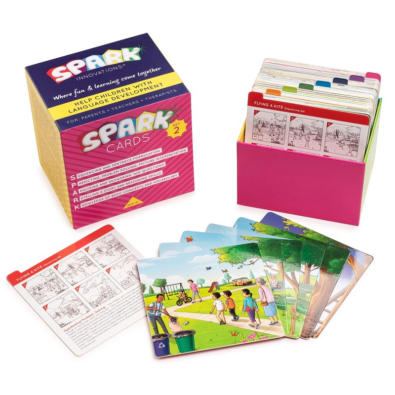 - ADAPTABLE FOR ALL AGES – Spark Cards #2 are a Perfect Speech Therapy Game For Classroom and Center Based Activities, individual therapy sessions, at home with parents and entire family. Skill level of cards is adaptable to many levels by simply trimming or using all the cards in a set. Starting from age 4 Story Cards are Suitable For Kids Of All Ages