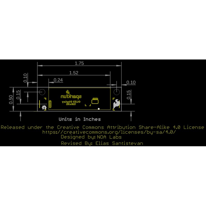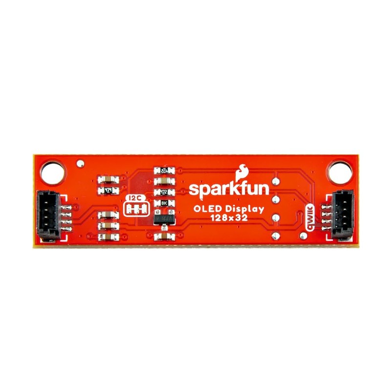 - Features: Operating Voltage: 3.3V via Qwiic Connector, Display IC: SSD1306, Screen Size 128px x 32px, Monochrome Blue-on-Black, Communication Protocols: I2C, I2C Address: 0x3C, 2x Qwiic Vertical Connectors, Built-in I2C 4.7kΩ Pull-Up Resistors, I2C Jumpers for Pull-Up Resistors, Board Dimensions: 1.75in. x 0.50in. (44.45mm x 12.7mm) Weight: 3.25g.