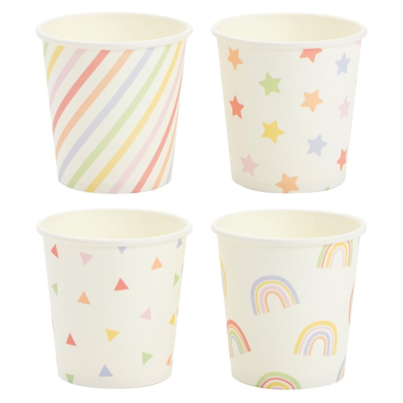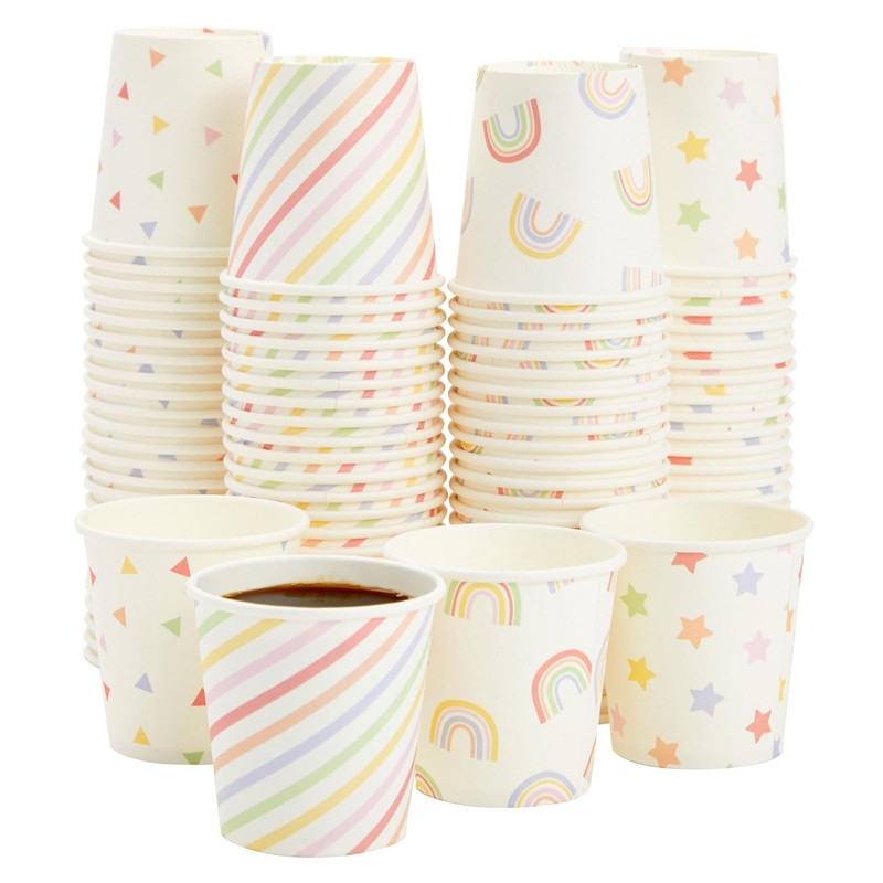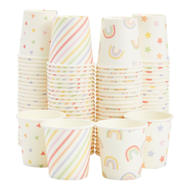 - What's Included: Includes 100 mini paper cups with rainbow, stars, and confetti designs
