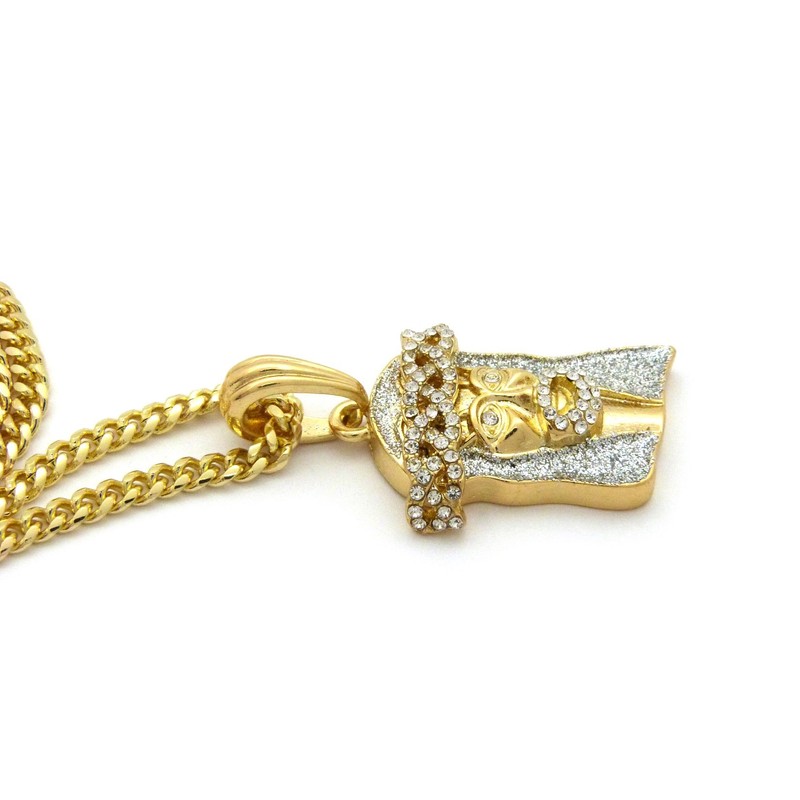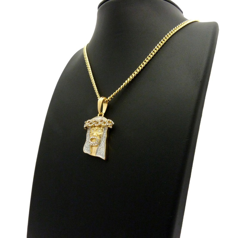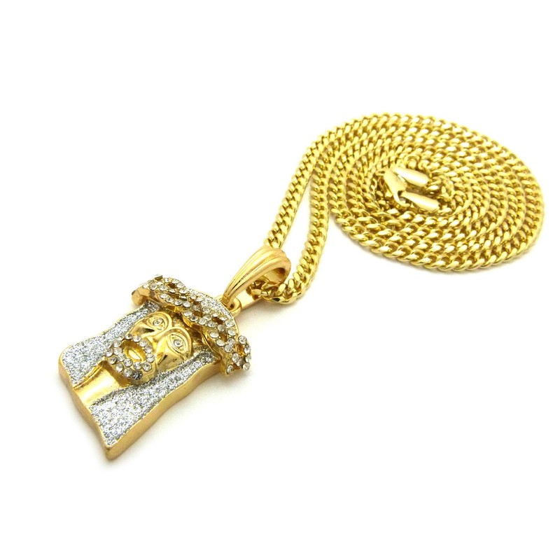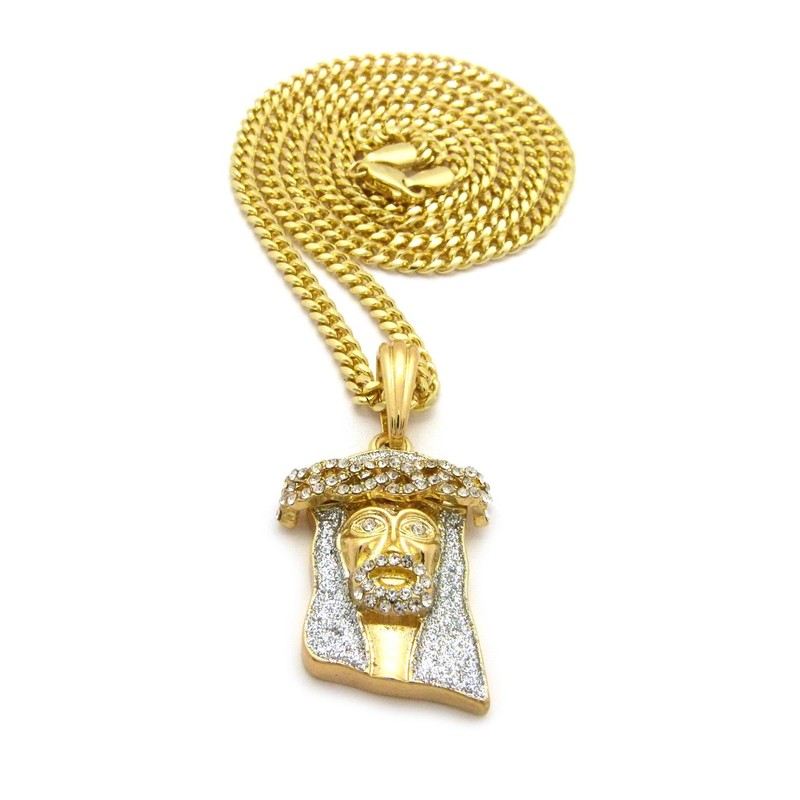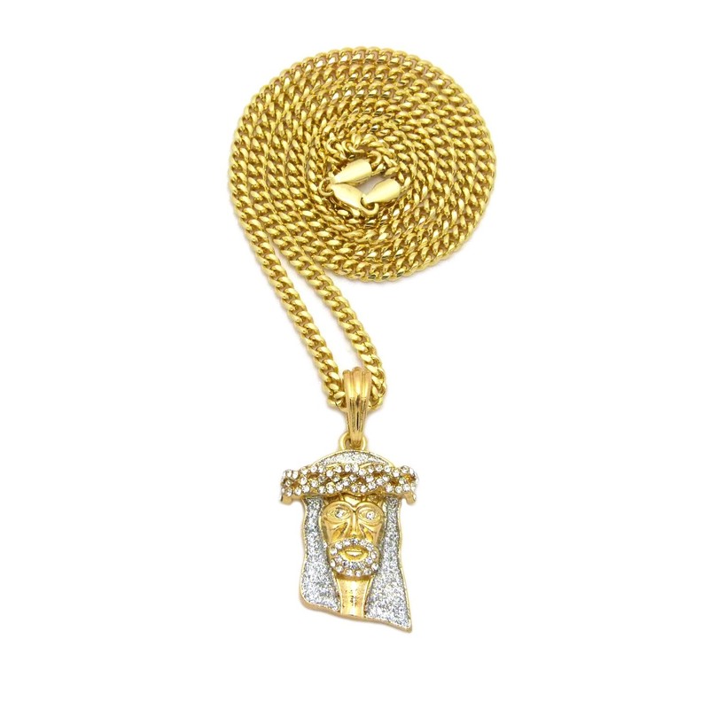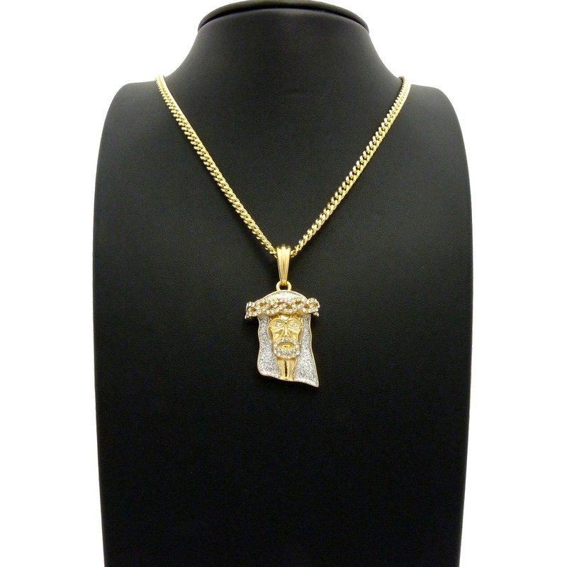 - Sparkled Stone Stud Jesus Face Pendant 24" Various Chain Necklace in Gold Silver Color Tone