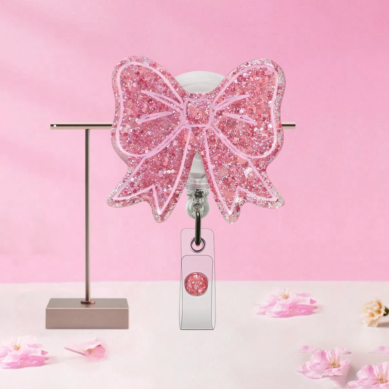 Sparkling Bow Badge Reel, with Retractable Cord and Swivel Alligator Clip, for Nurses Teachers Doctors Medical Assistants (Rose Gold)