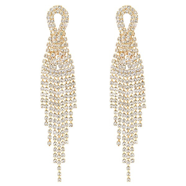 Sparkling Bridal Wedding Prom Rhinestone Tassel Long Dangle Drop Large Gold Color Statement Earrings(CA)