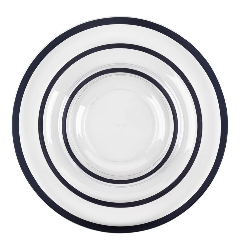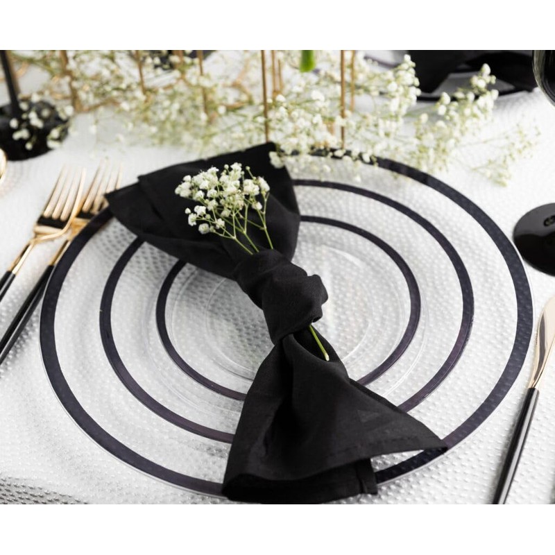 - ✓DESCRIPTION – These clear disposable plates set with black rim will add a luxurious look to your table. Our set of black rimmed plastic plates includes three sizes plates and can brighten your guest's eyes and leave a deep impression on them.