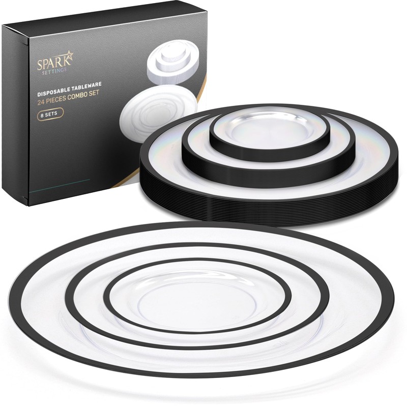 SparkSettings Clear and Black Plastic Plates, 24 Pack Black Clear Disposable Plates for Party, Wedding, Includes: 8 Dessert Party Plates 7” and 8 Dinner Plates 10" and 8 Charger Plates 13"