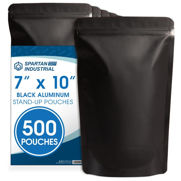Spartan Industrial 7" X 10" Matte Black Stand-Up Pouches - 500 Count Smell-Proof Mylar Bags for Food Storage With Heat Sealable Opening and Resealable Zipper