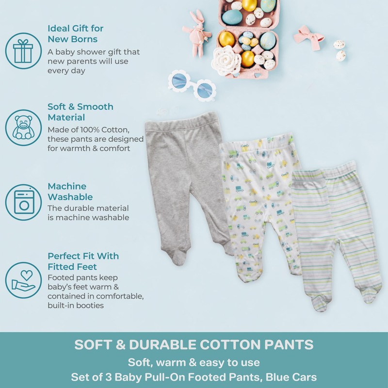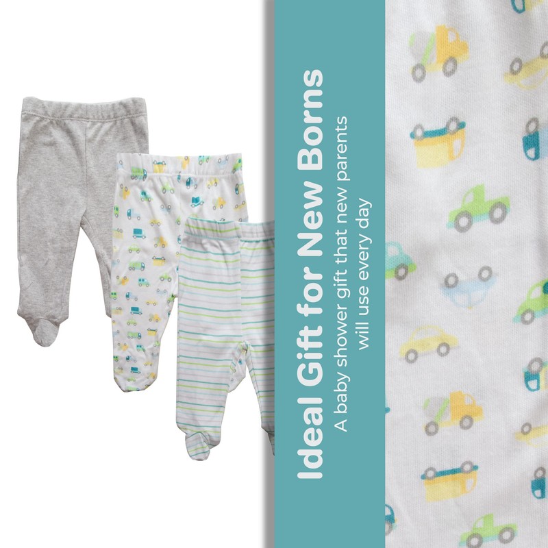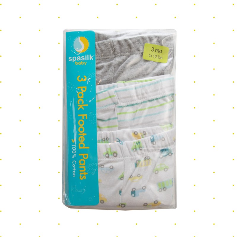 Spasilk Paquete de 3 Pantalones de algodón con pies para bebé, Carros Azules, 3 Meses