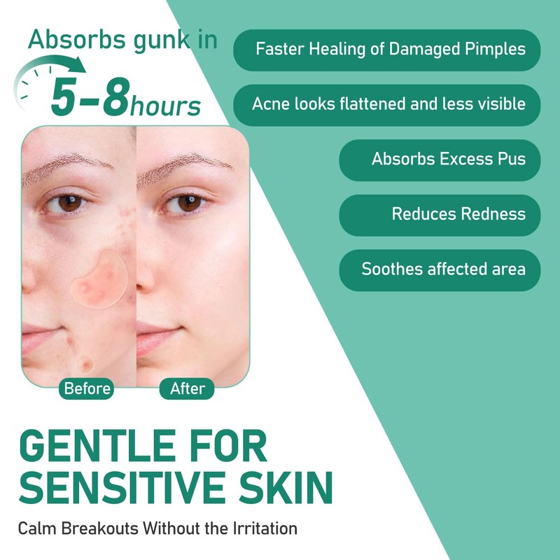 • Pimple Be Gone: Our hydrocolloid pimple stickers feature 60% more gunk-absorbing strength, effectively pulling pus from whiteheads at the source. In just 6 hours, these acne dots help reduce the appearance of pimple or large clusters, leaving your skin looking flatter and clearer