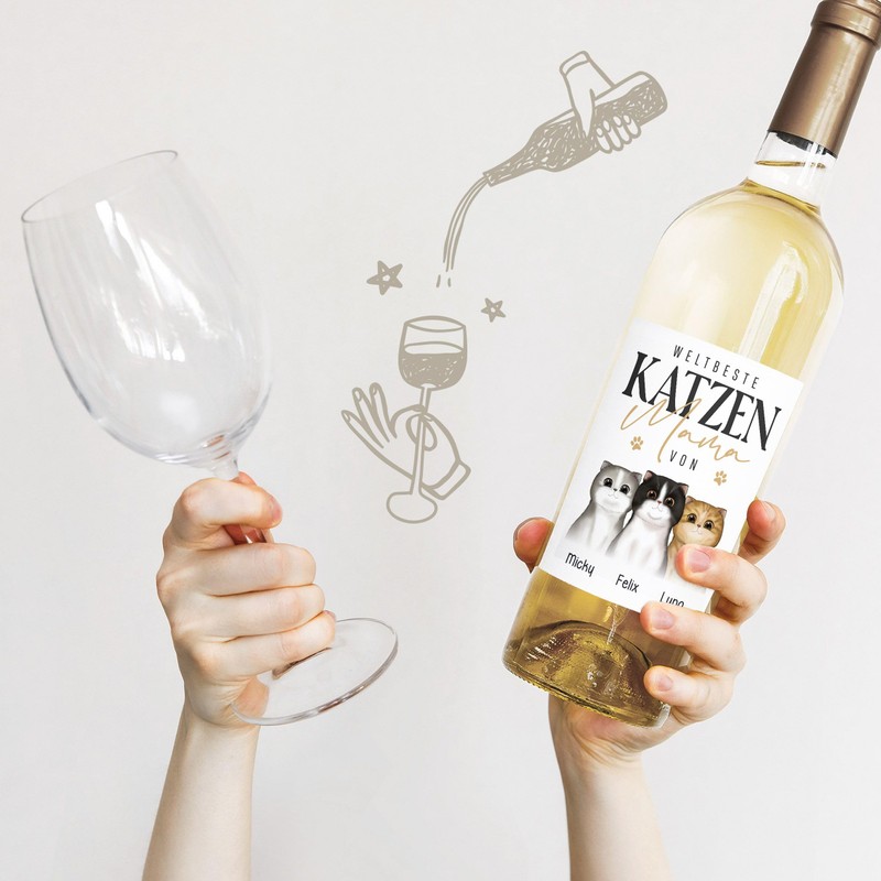 - Liebevolles Design für Katzenmamas mit Herz. Mit niedlichen Illustrationen und der Aufschrift „Weltbeste Katzenmama“ wird jede Weinflasche zu einem emotionalen Highlight – perfekt als Geschenk von oder für Katzenliebhaber