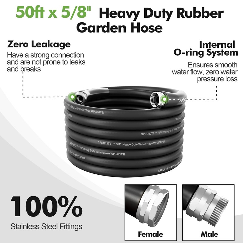 SPECILITE Garden Hose 50ft x 5/8" with High Flow Nozzle, Heavy Duty Water Hose,Flexible Hybrid Rubber Hose Tough for Yard Outdoor Lightweight, Leak-Proof&No-Kink,3/4"Stainless Steel Fittings