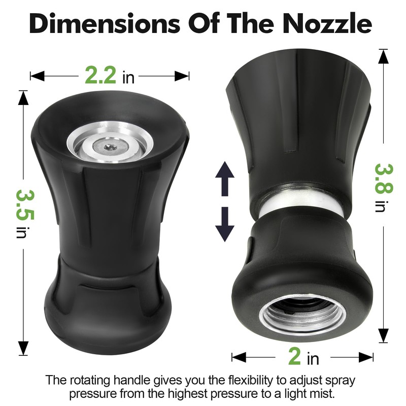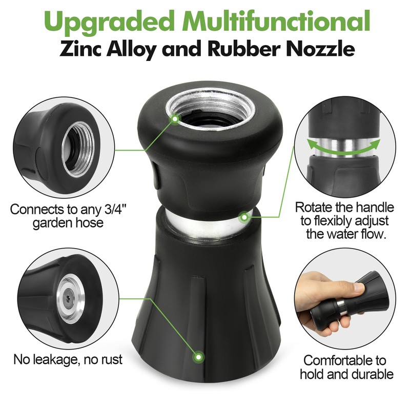 - High Water Flow Nozzle:The rubber water hose has a higher water flow,the nozzle is made of high quality zinc alloy and rubber can be connected to any standard US 3/4” garden hose.The swivel handle gives you the flexibility to adjust spray pressure from a light mist to a large stream or even high pressure rapids. Rupture pressure 600psi / Working pressure 200psi