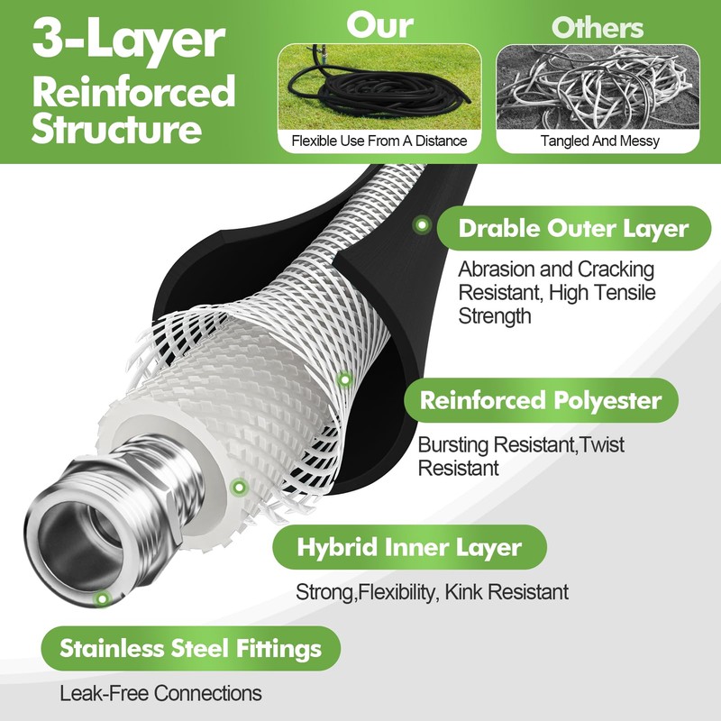 - Durable Construction:Expertly developed hybrid material from rubber and polymer, 3-Layer reinforced structural rubber hose is extremely tough. The hose ends are made of 100% stainless steel fittings and screw core, effectively prevent rust and leakage