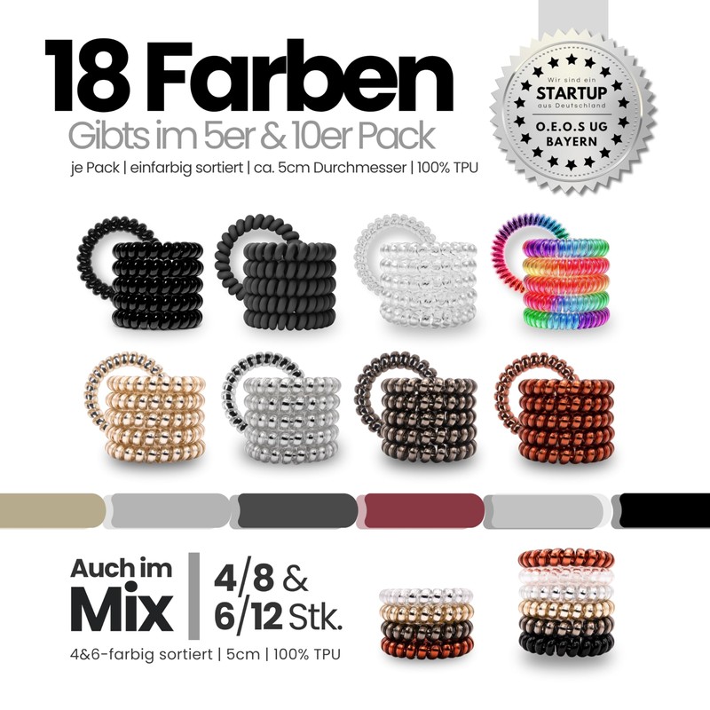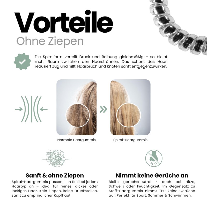 - Practical and versatile: suitable for all hair types. Easy to create hairstyles. Whether ponytail, bun or half-up style. Our spiral hair band keeps your hair discreetly and reliably together.