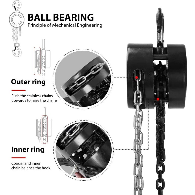 - DURABLE DESIGN - The hoist is equipped with an alloy steel manual chain, specifically designed for robustness; This heavy-duty chain undergoes forge heating and is combined with steel gear milling to enhance its durability; Additionally, a cold-rolled steel cover protects the chains and gear system, further reinforcing the reliability of this hoist