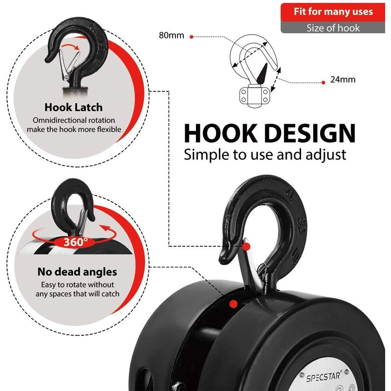 SPECSTAR Big Black Chain Block / Manual Hoist with 2 Hooks, 1 Ton (2,000 lb) Capacity