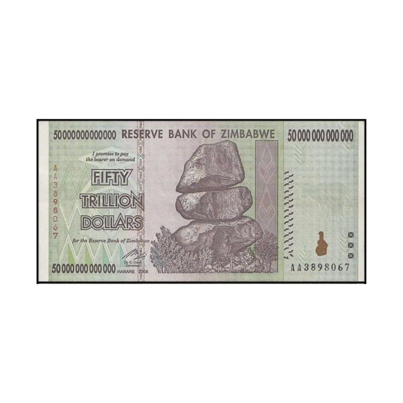 • 50 Trillion Zimbabwe Dollars Note - This 2008 replacement banknote features the Chiremba balancing rocks. On 30 July 2008, the dollar was redenominated, and a new currency code of ZWR was introduced. After 1 August 2008, 10 billion ZWN were worth 1 ZWR. The Zimbabwe Dollar was established to replace the Rhodesian Dollar and to signify the nation’s independence from the UK in 1980. It was redenominated 3 times until