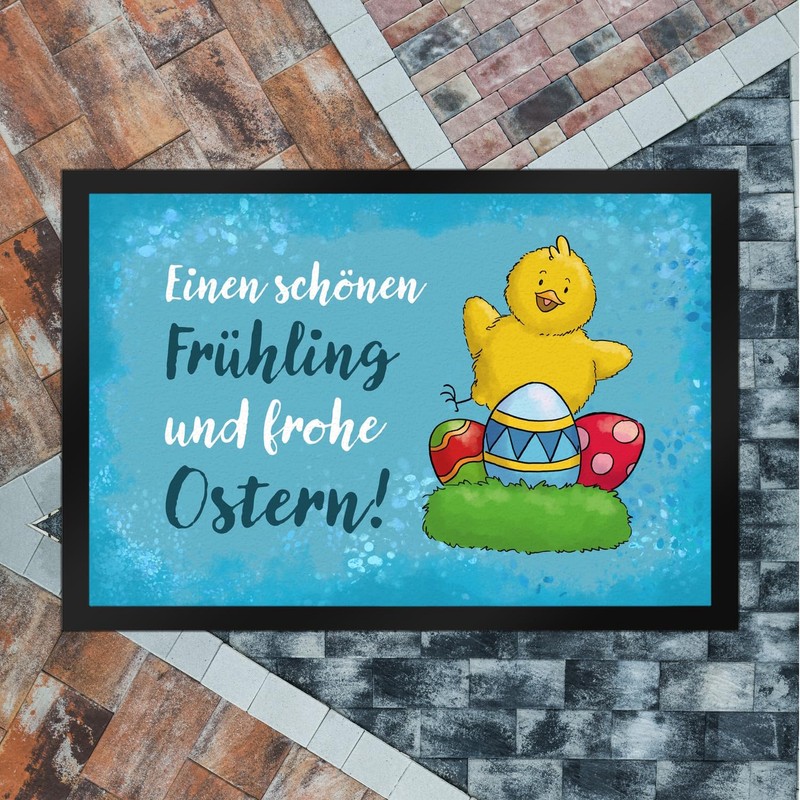 • The doormat reads the saying: A beautiful spring and happy Easter! A cute chick can be seen as a motif. It sits in a nest with brightly painted eggs. The background is blue.