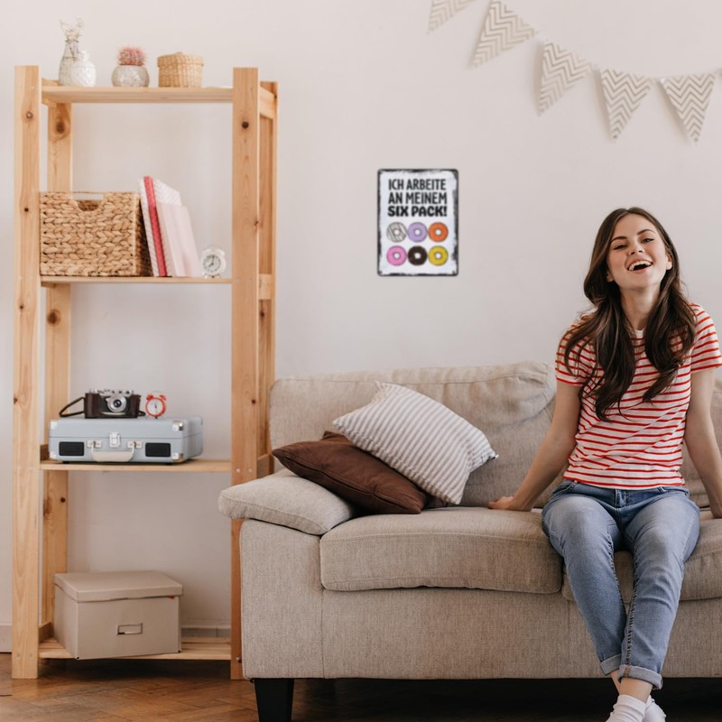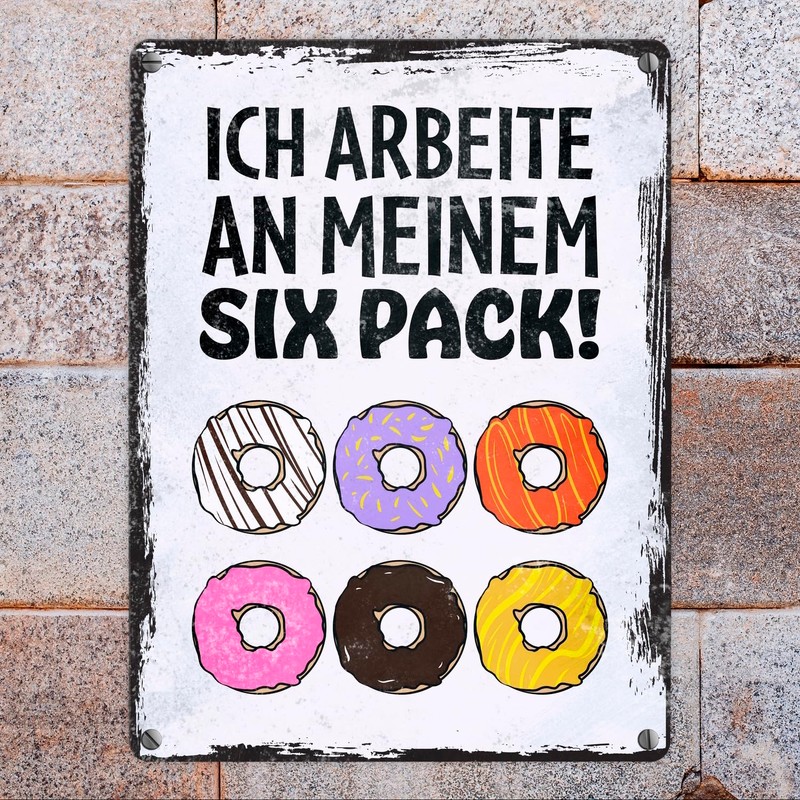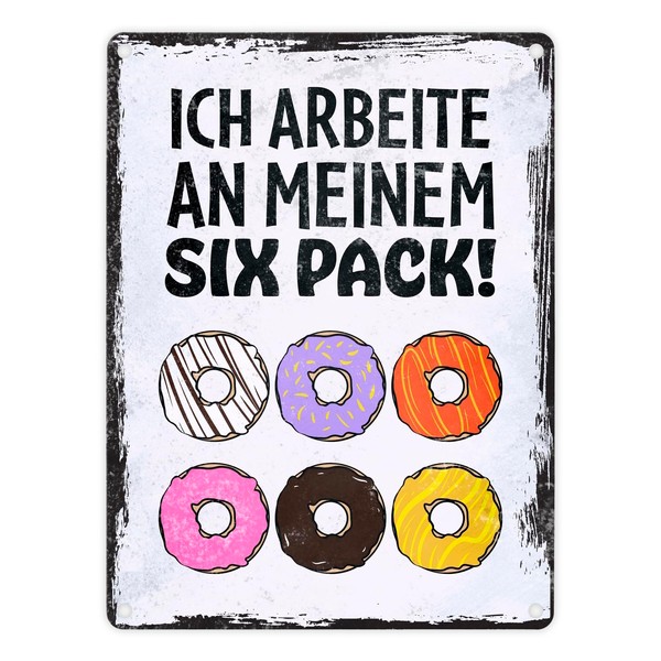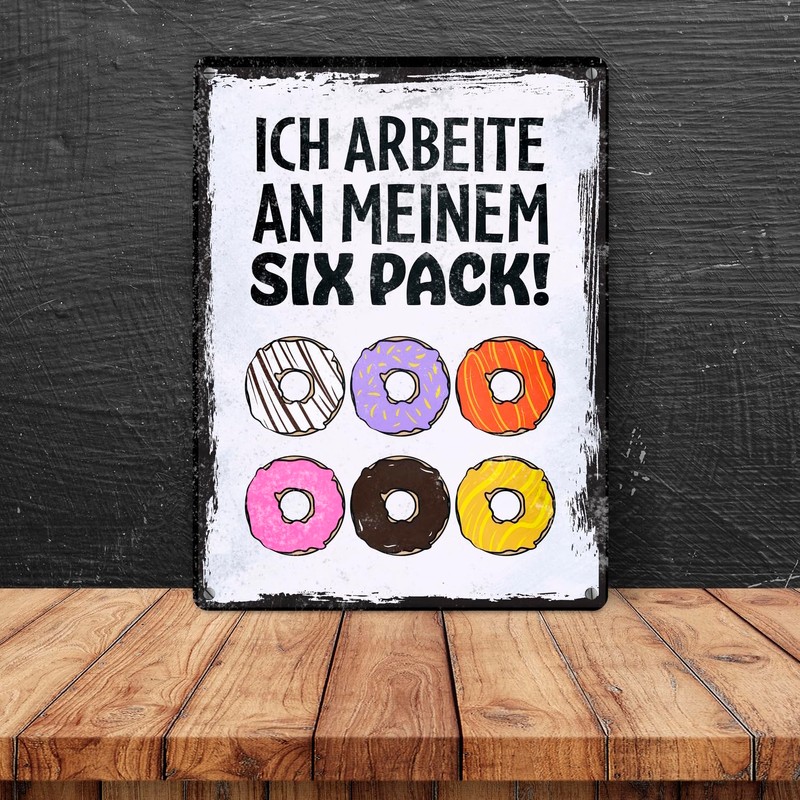 • Box contents: 1x Ich arbeite an meiner Six Pack metal sign with delicious doughnuts