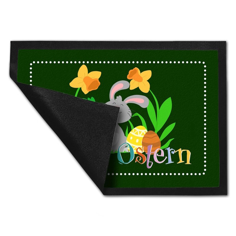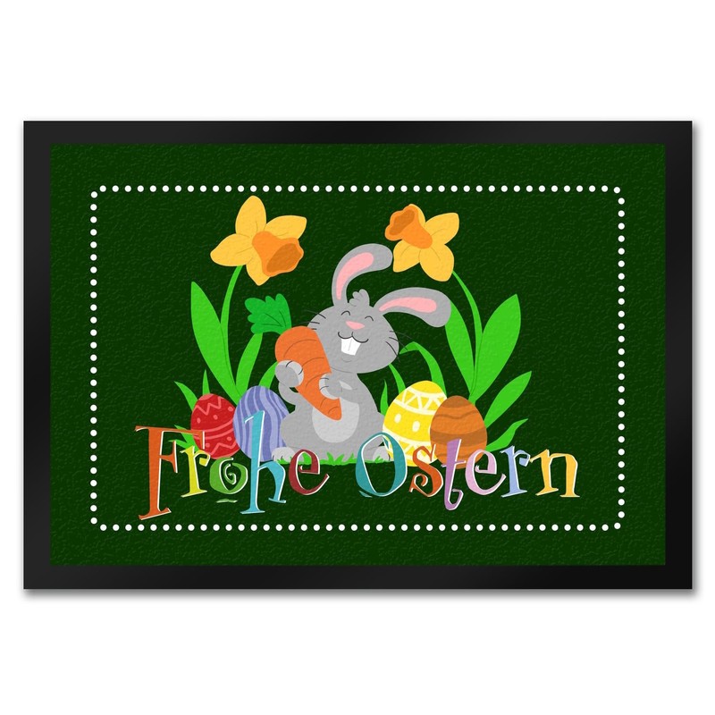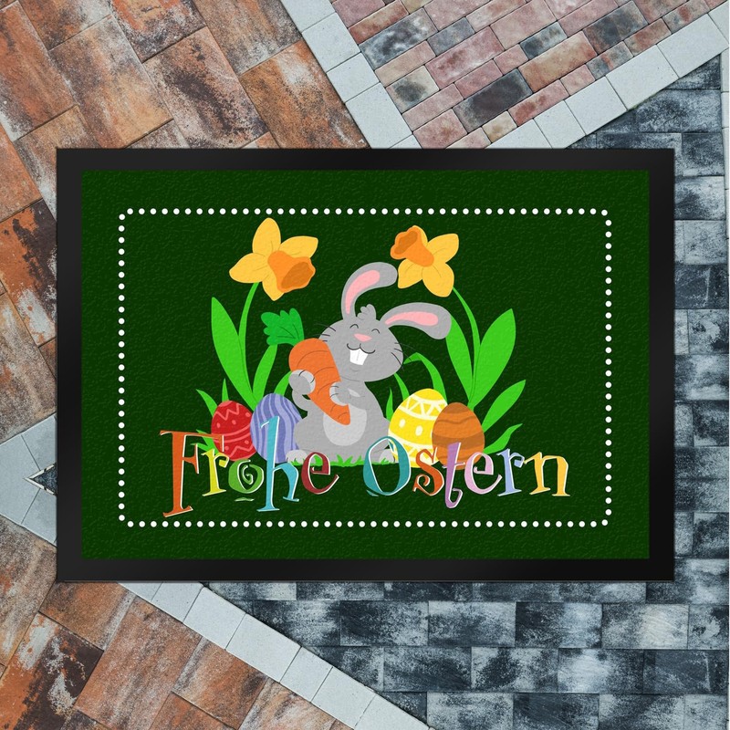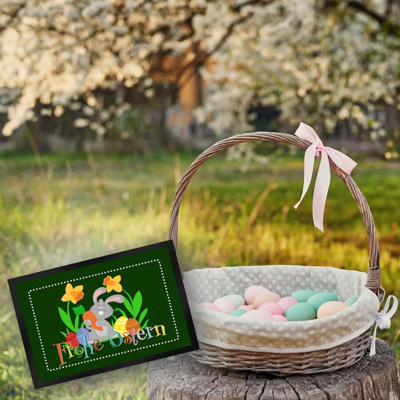 • On the doormat you can see an Easter bunny with carrot in his paws, colourful Easter eggs and beautiful Easter bells. Underneath it says in colourful letters 'Frohe Ostern'.