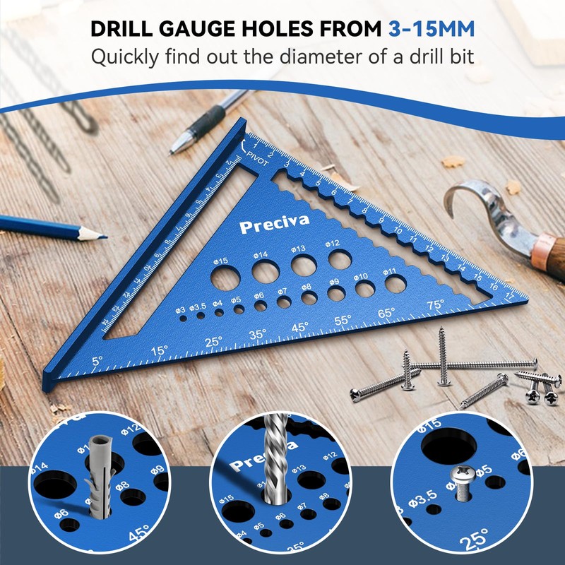 Speed Square, Preciva 7inch/180mm Set Square, Triangle Ruler with 14 Types of Drill Holes, Blue