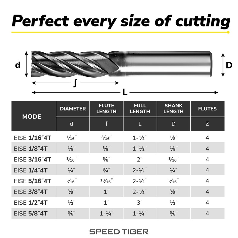 Your search for the perfect end mill is over! Our unique drill bit sets are ideal for various drilling, machining, and manufacturing needs. Tired of mediocre end mills on the market that fail to meet your expectations? Looking to enhance your craftsmanship and take your projects to new heights? Seeking a reliable tool to cater to your expertise?Unlike other end mills that compromise on quality and performance, our end mills are crafted with the utmost care and precision, ensuring superior results every time.Introducing Speed Tiger's premium end mill collection, designed to empower DIY enthusiasts and experts alike.FEATURES:Carbide Square End Mill (ISE– 4 flute, 7/64”): 5 piecesBENEFITS:Can be used in various materials from wood to steel, an excellent value for your home and store work needs.Made from micrograin carbide, it has exceptional toughness, durability, and machinability. It performs brilliantly and is an excellent value for its price.Nano precision to manufacture our end mill with the accuracy of ±2μm to enable users to achieve professional cutting quality.Manufactured with robust and tempered steel construction, our drill bits are designed to last, providing superior durability and performance.Featuring an industrial grade, our particular coated drill bit set provides your drill with a longer life, more excellent grip, and precision accuracy, even on the most challenging metals.We provide you with the absolute best customer service. Should you have any issues with the product, we will refund your full purchase price!Rest assured, our products prioritize your safety and are manufactured with the highest standards in mind. Due to high demand and sustainable production practices, our stock is limited.Elevate your creativity and design skills to the next level with Speed Tiger's end mills today!