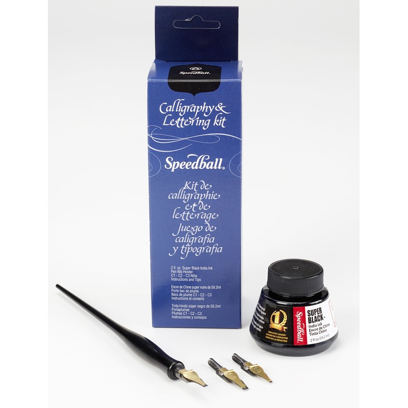 This calligraphy kit is an ideal introduction to calligraphy and lettering, making learning beautiful writing easy. Contains threecstyle pen nibs (C1, C2, C3), perfect for Roman Gothic alphabets, Italic alphabets, accented line drawings, scrolls and Scripts. Nibs are designed with reservoirs that allow for uninterrupted ink flow. Includes 1 2-ounce jar of super black India ink, 1 speedball pen holder and lettering tips and instructions. Made in USA.