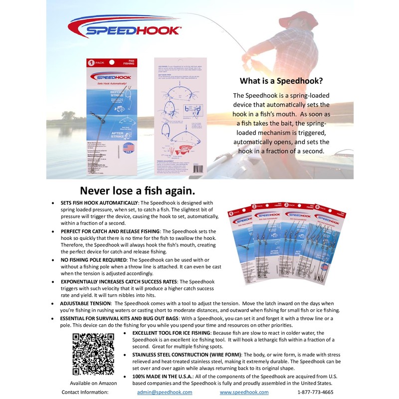 - ESSENTIAL FOR SURVIVAL KITS AND BUG OUT BAGS: With a Speedhook, you can set it and forget it with a throw line or a pole. This device can do the fishing for you while you spend your time and resources on other priorities.