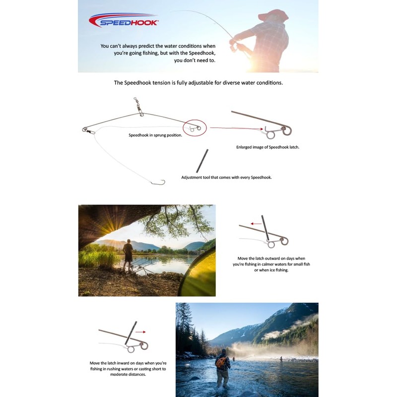 - ADJUSTABLE TENSION: The Speedhook comes with a tool to adjust the tension. Move the latch inward on the days when you’re fishing in rushing waters or casting short to moderate distances, and outward when fishing for small fish or ice fishing.
