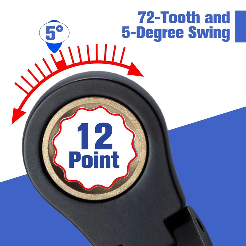 • 【72-TOOTH RATCH DESIGN】The 72-tooth design increases contact dimension with the nut for greater friction and less slippage. Only a 5 degree swing arc that is perfect for restricted, hard to reach work spaces.