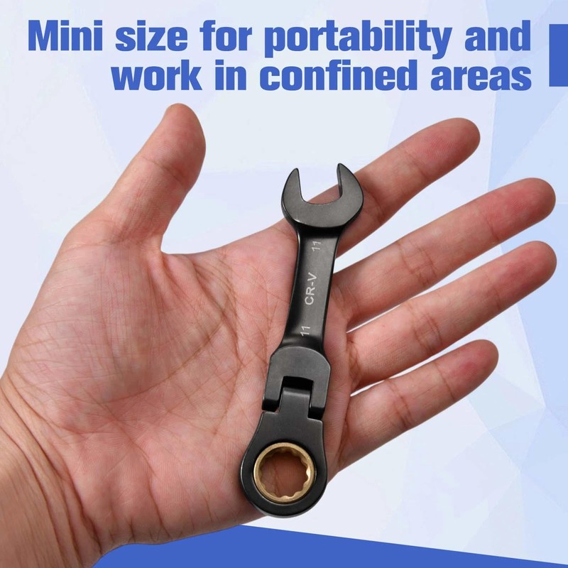 【11MM Flex-Head Stubby Ratcheting Wrench】【SPECIFICATION】Material: CRV steel ; 【WHAT YOU GET】11mm ratcheting wrench.【CAUTION】 1. Please inspect before every use. Do not use if damaged. 2. Some oil on the surface to keep products free of rust, it will not affect the performance just wipe it clean with a rag or old towel.