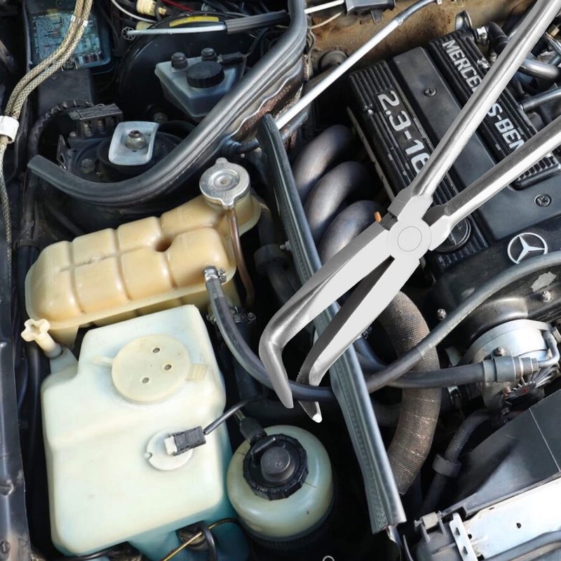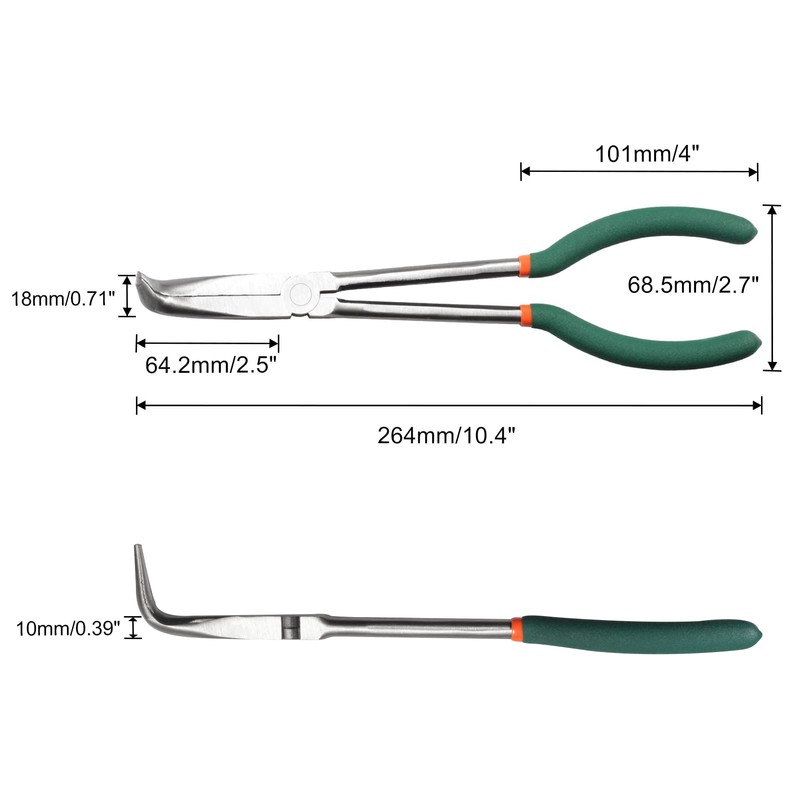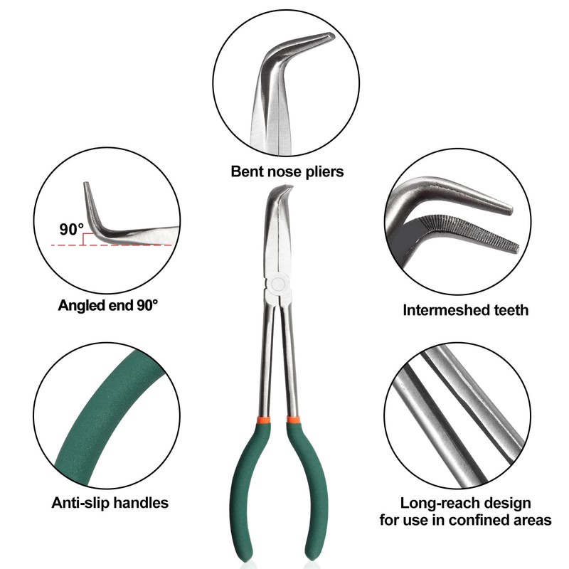 - 【USAGE】 Long-reach design combined with the compact size makes the pliers ideal for use in confined areas. Designed for working around obstructions. The 90°jaws are great for grasping and bending wires. A must-have tool for automotive work, mechanics work, art and craft, and other hobby work.