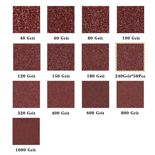 - WIDELY APPLICATIONS Good choice for wood sanding, 40 60 80 grit for rough wood, 100 120 150 180 grit for general wood, 240 320 400 600 800 1000 grit for final finishing of wood, plaster, leather, stone, glass and other surfaces.