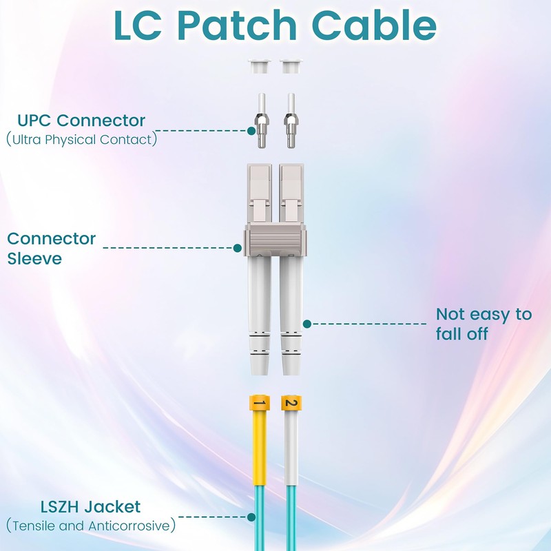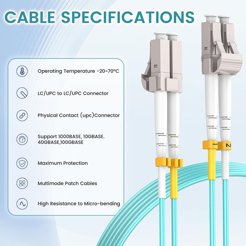- 🔌 Precision UPC Connectors & Duplex Design: Ultra Physical Contact (UPC) zirconia ferrules and secure connector sleeves ensure stable, low-loss transmission over 1,000 cycles. LC to LC duplex enables bidirectional data flow.