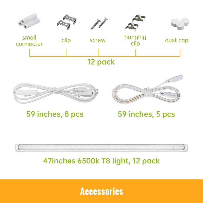 - Package Include - 12 x LED Shop Light, 6 x 59 inches Power Cord Cable with ON/OFF switch, 8 x 59 inches Connecting Cable, 26 x Ceiling Clips, 24 x Hanging Ceiling Clips, 27 x Screw, 1 x Installation Manual, and so on. Please let us know if there are any questions. Our customer support team is standing by to assist you