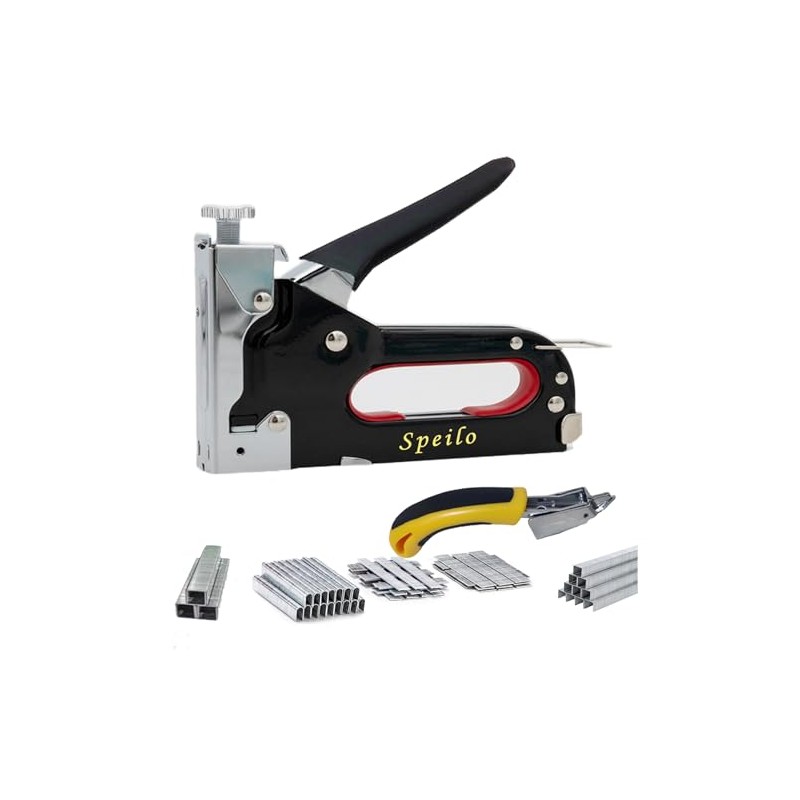 Introducing the Speilo Heavy Duty 4 - in - 1 Multifunctional Staple Gun Kit, a game - changer in the world of staple guns. Whether you're a professional in construction or a DIY enthusiast working on home projects, this staple gun is designed to meet your every need. Heavy - Duty Compatibility: This is not just an ordinary staple gun; it's a heavy - duty staple gun for wood and other tough materials. Crafted to be compatible with T50 stainless steel #304 staples, D-type, U-type, I-type and other T-shape staples. Your package includes a generous supply of 600pcs 1/2" Leg 3/8" Crown staples. Using the correct staple size is half of your project success. It's the perfect wood staple gun for all your heavy - duty tasks. Ergonomic & Safe Design: When it comes to long - term use, comfort and safety are paramount. This upholstery staple gun heavy duty features an ergonomic grip that fits comfortably in your hand, reducing strain during extended projects. The added handle lock is a thoughtful safety feature that secures the staple gun when it's not in use or when you're on the move. User - Friendly Production: Loading staples is a breeze with the quick - release loading magazine located at the bottom of the gun. This wood stapler gun with staples drives staples with pinpoint accuracy, ensuring a clean and professional finish every time. Ultra - Lightweight and Portable: Weighing in at just 1.18 lb, this staple gun for upholstering is incredibly lightweight and portable. Its compact design allows it to fit seamlessly onto any tool belt, making it the ideal companion for on - the - go projects. Whether you're working on a construction site or a home DIY project, you'll always have easy access to this essential tool. All - Around Utility: This heavy - duty staple gun is a true all - rounder. It's perfect for a wide range of tasks, from professional construction projects to home crafts. Use it for insulation, upholstery, general repairs, or even for constructing a hoop house for your chickens. It's a furniture staple gun that will quickly become an essential part of your toolkit.