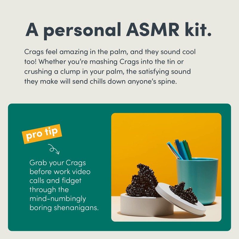 - ASMR ON DEMAND: Yeah, you’ve watched the videos. They’ve made you feel things; oddly satisfying, tingly things. We’re talking about the ASMR clips with sound so titillating your eardrums need a cigarette afterward. And now with Crags, you can get your serving of sonic ecstasy whenever you please. Crush these fidget toys for adults in your palm and send a tingle up your spine. Drop them back into the metal tin and invite a smile. Slither them onto your desk and feel your toes curl a bit.