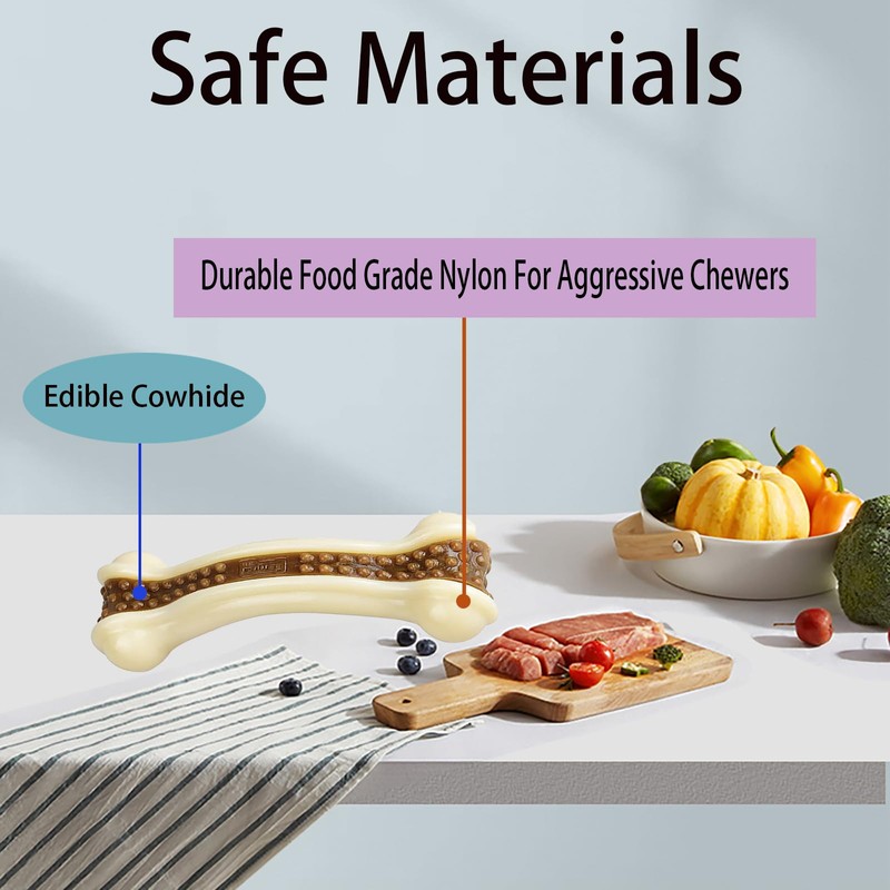 • Safe Dog Toys:Made of Durable Food-Grade Nylon And Edible Cowhide,Free of BPA and phthalates, Safe, Non-toxic, Help clean teeth and control plaque and tartar during the chewing process.