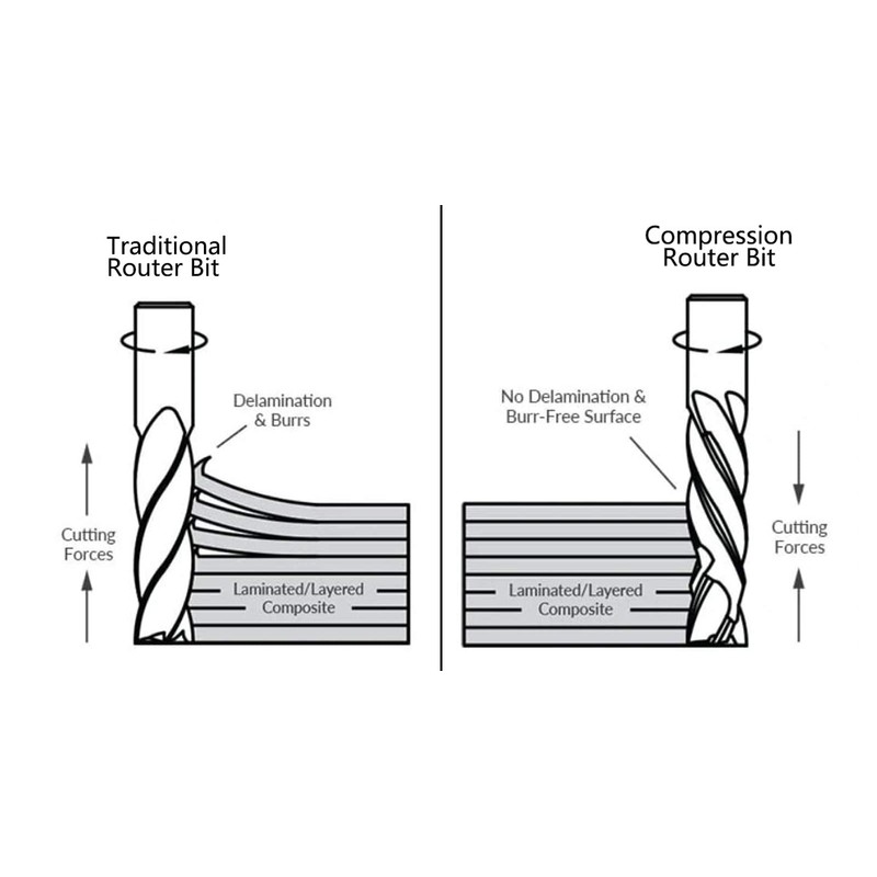 The compression cutters are designed with both up and down-cut flutes. The top portion of the length of cut, closest to the shank, has a left hand spiral, forcing chips down. The bottom portion of the length of cut, closest to the end, has a right hand spiral, forcing chips up. When cutting, the opposing flute directions generate counteracting up-cut and down-cut forces. The opposing cutting forces stabilize the material removal, which compresses the composite layers, combatting delamination on the top and bottom of a workpiece.