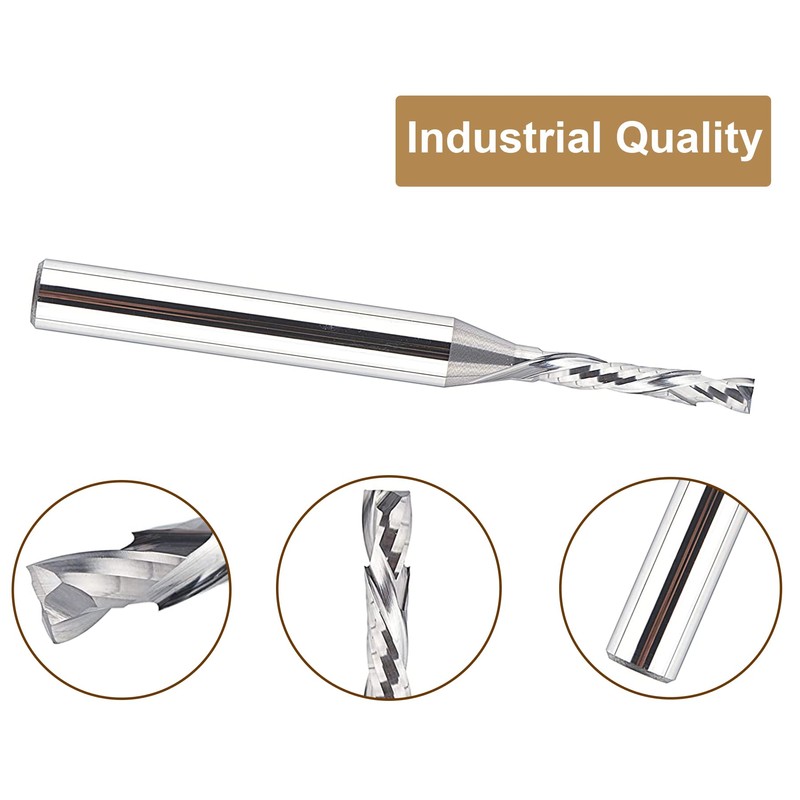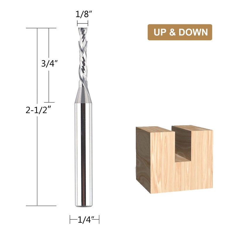 - UP&DOWN Solid Carbide spiral router bit with 1/4inch shank and 1/8inch cutting diameter, 3/4inch cutting length, 2-1/2 inch extra long for total length