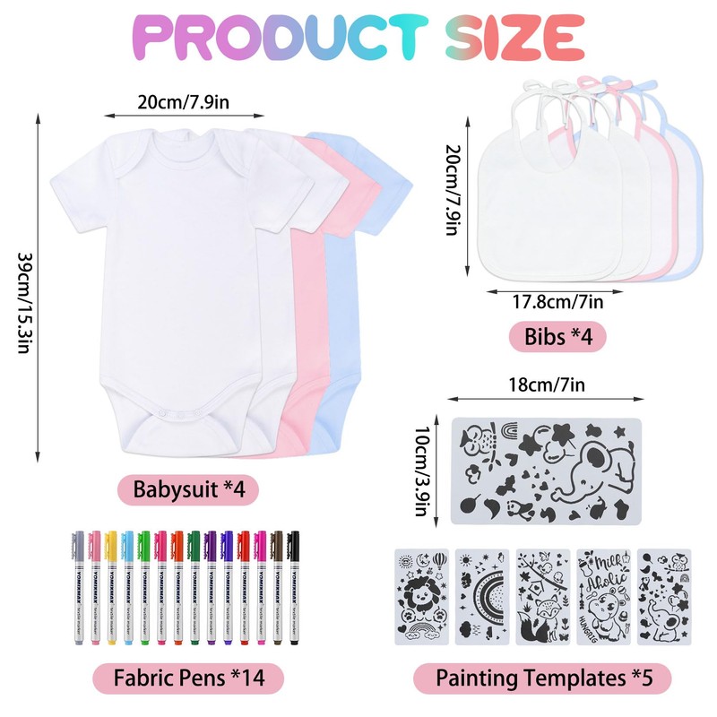 - Easy care for long-lasting fun: After designing, the bibs and bodysuits should rest for 24 hours to fix the colours. Avoid strong rubbing or soaking when washing to maintain the quality and bright colours. Enjoy carefree creative moments