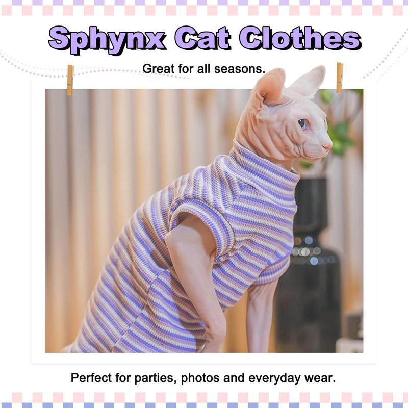- 【SOFT AND SKIN-FRIENDLY】Sphynx hairless cats‘ skin is very sensitive and vulnerable. If your pet have an allergic reaction, hairless cats shirt which are made of soft and anti-allergy cotton can meet your needs. This fashionable round collar vest fits Sphynx Cat, Devon Rex Cat, Cornish Rex Cat and Peterbald Cat. Super stretchy material makes the pullover stripe cat pajamas easy to pull on and take off.