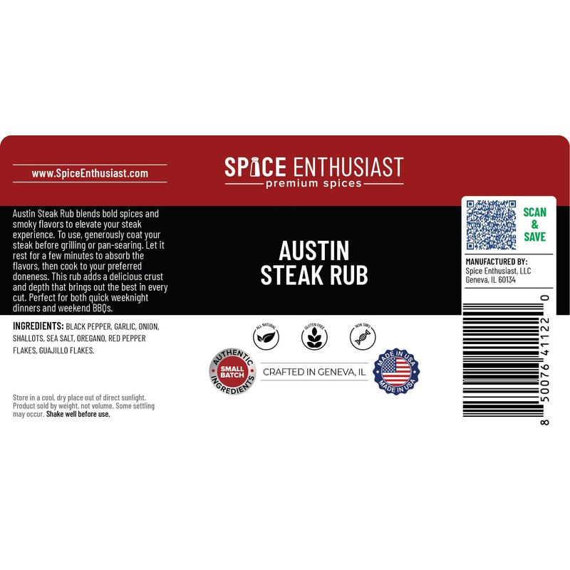 Austin Steak Rub blends bold spices and smoky flavors to elevate your steak experience. Designed to enhance natural beef richness, this coarse rub includes a balanced mix of garlic, black pepper, shallots, and other savory herbs. To use, generously coat your steak before grilling, pan-searing, or broiling. Let it rest for a few minutes to absorb the flavors, then cook to your preferred doneness. This rub adds a delicious crust and depth that brings out the best in every cut. Perfect for both quick weeknight dinners and weekend BBQs.