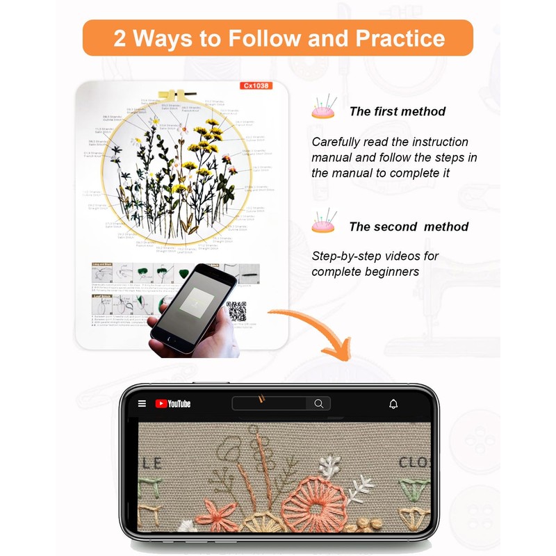- Perfect for First-Time Crafters: Beginner-friendly embroidery kit includes 3 pre-printed cotton cloths with water-soluble ink patterns and step-by-step tutorials. Learn 15+ stitches like satin stitch and French knot with our illustrated stitch guidebook