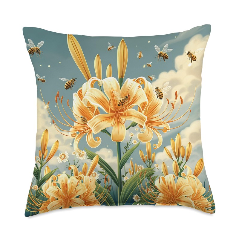 Spider Lily Flower Blooming With Bees Around Graphic Throw Pillow
