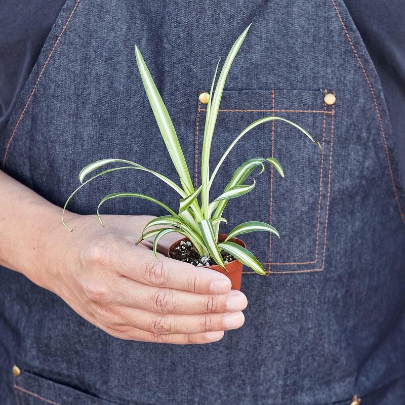- Description: The Spider plant is a flowering perennial native tropical South Africa. The leaves of the spider plant are thin ribbon like strands which end in a point and grow upward and bend downward giving it the look of a spider, this particular variety will have leaves which grow outward and upward.The Spider plant produces small white flowers that grow along a long stalk independent to the leaves of the spider plant. Also known for their air purifying qualities,the spider plant is a great companion to any household of office.