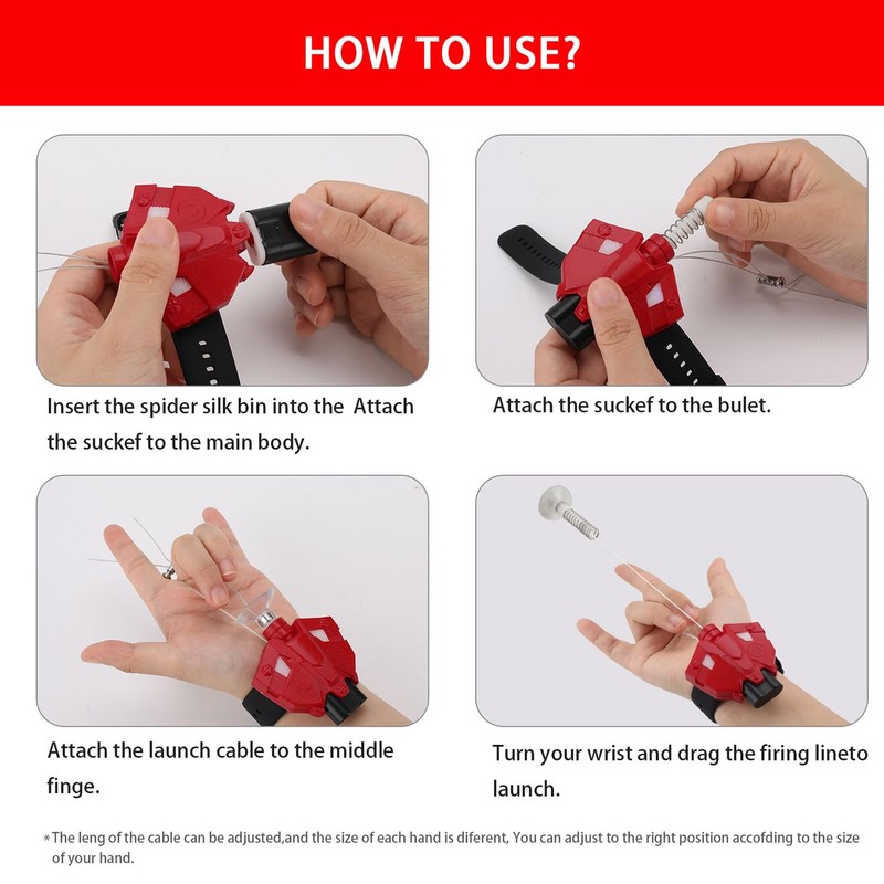 - EASY TO USE - The launcher is easy to use. Just press the launch switch to shoot the silk. The head with a magnet can be adhere to iron products after being launched. If the magnet is replaced with a suction cup, the head can be adhere to a smooth and flat object.