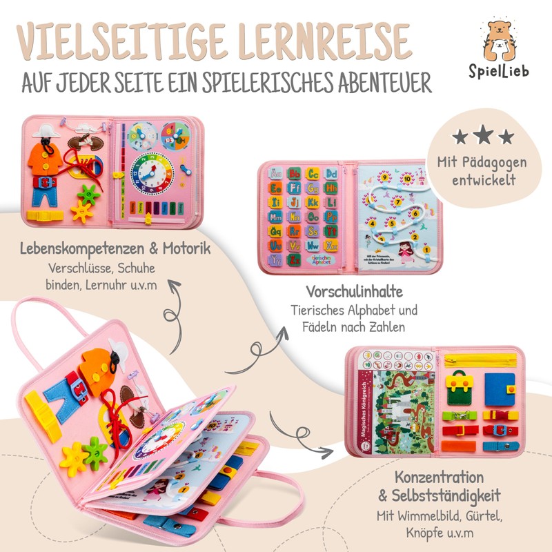 • ✔️ Educational learning toy – The Montessori Busy Board in German trains language development, fine motor skills, colour perception and hand-eye coordination - promotes important life skills.