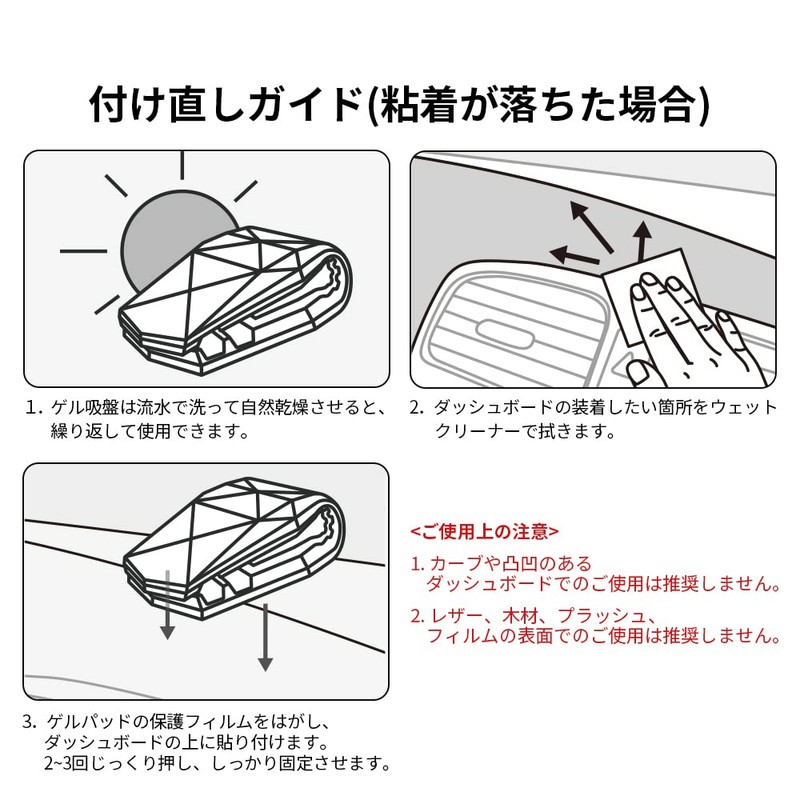 - Installation Methods and Precautions: Wipe the area you want to install the dashboard with a wet cleaner, peel off the protective film of the gel pad and stick it. Press 2-3 times and lock in place. Adhesive strength may weaken on curved and uneven dashboards, leather, wood, plush, and film surfaces