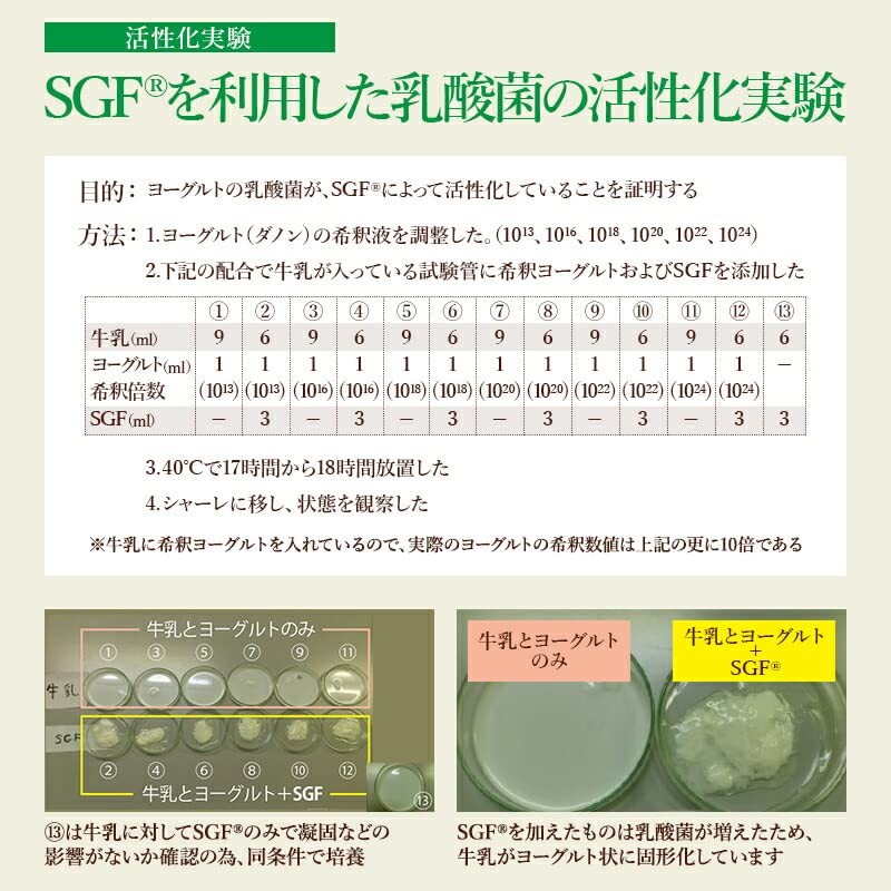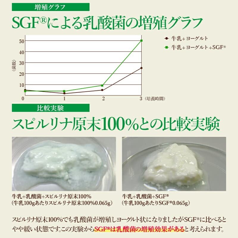 SGF is a growth factor of spirulina algae (indigo algae). The SGF strengthened spirulina is an exclusive SGF extracted and powdered product formulated with 5% of the standard spirulina.